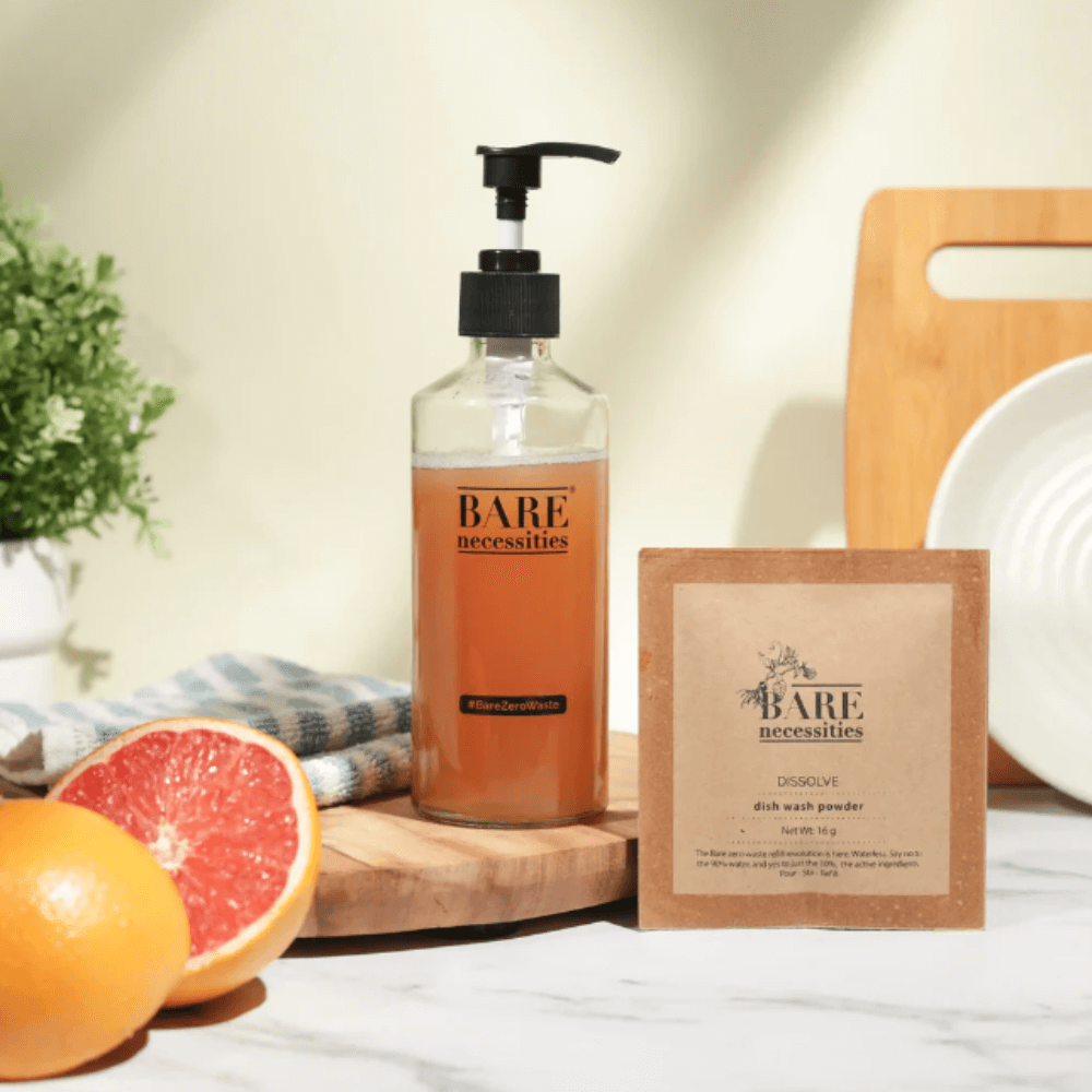 We bring you Bare Necessities Dish Wash Powder, Dissolve! Rather than buying heavy containers full of water, get only the active ingredients and mix it at home!