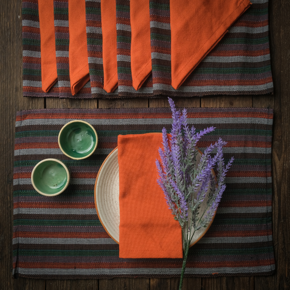Our vibrant Tablemats & Napkins serve as a testament to Chettinad's rich culture and history. Handwoven in one of the oldest surviving hand-weaving centres in the Kanadukathan village, these pure cotton tablemats exemplify the exquisite craftsmanship and enduring tradition of Chettinad handloom.